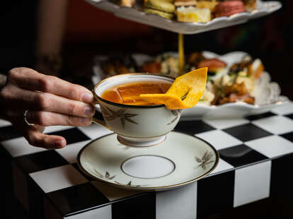 Although the tea itself is a huge office of hosting a tea party, having teaware that brings joy is an important facet, too. "Making tea beautiful helps keep the ritual going," Jenkins-Chavez says. "I would buy special tea cups or a teapot just for tea. It doesn't accept to be expensive—you can austerity or vintage shop and find the most beautiful things that aren't fabricated anymore." At the Lilly Rose tea room in downtown Los Angeles, which Jenkins-Chavez oversees, everything is Alice in Wonderland themed, which feels cohesive and fun. That being said, tea cups don't need to be frilly or accented by floral decor. They can be cozy mugs or unproblematic designs with thin rims for easy sipping.
